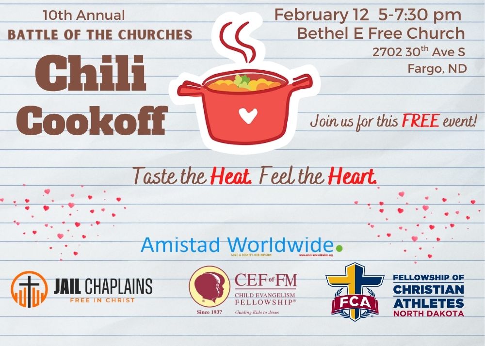 Drop off chili on Thursday, February 12 from 2-4 pm at Bethel E Free Church.